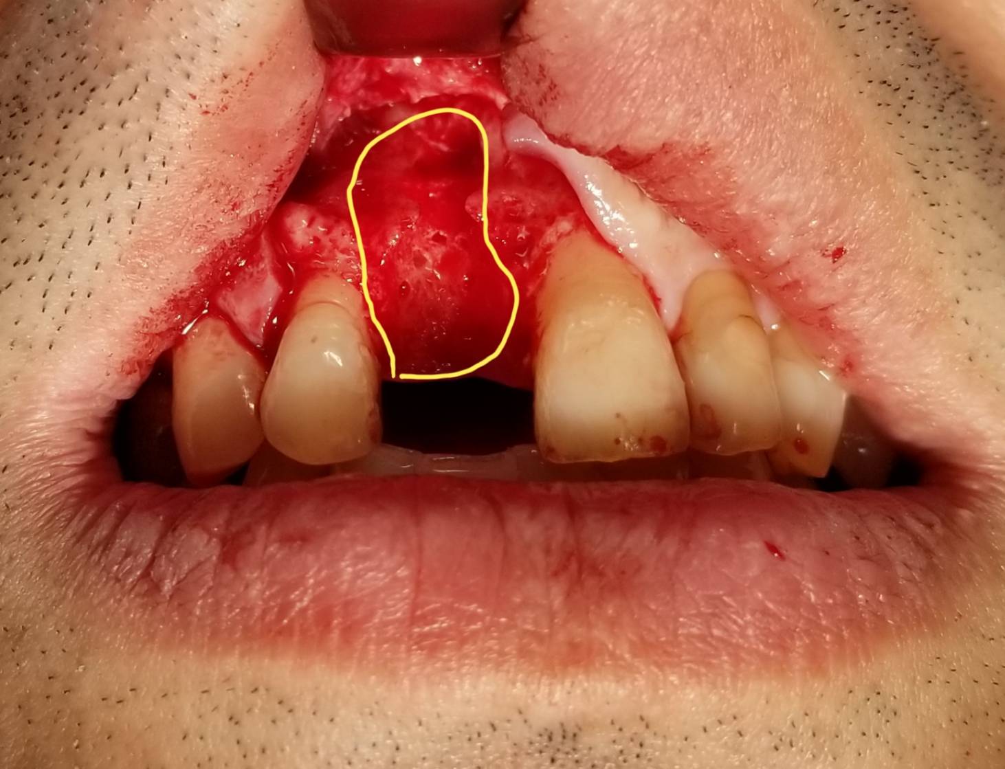 ここで頬側の骨と抜歯した穴が空いていますので、人工骨(白いブツブツの部分)を入れます。
